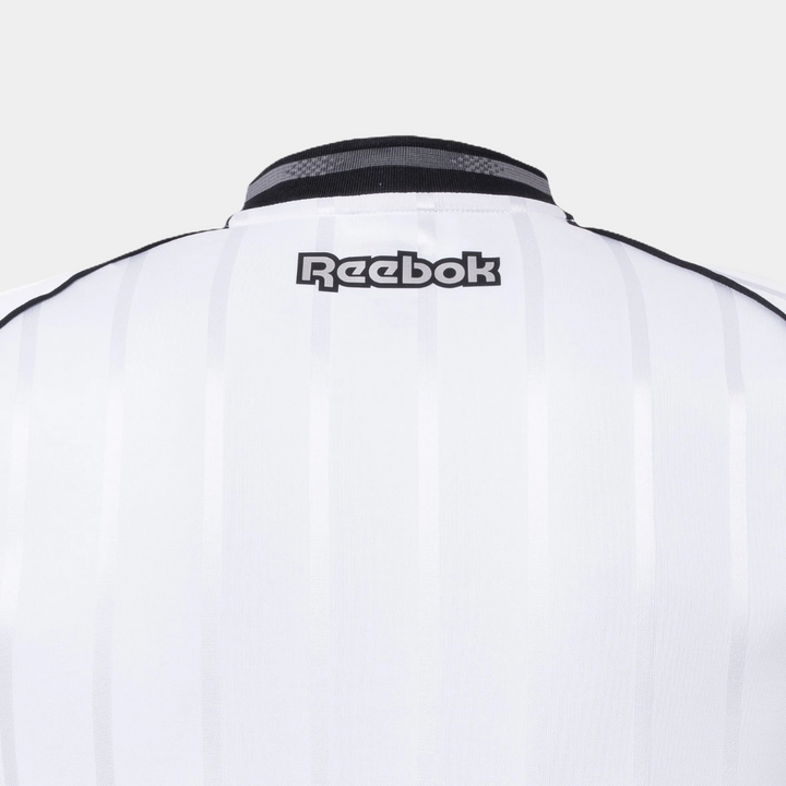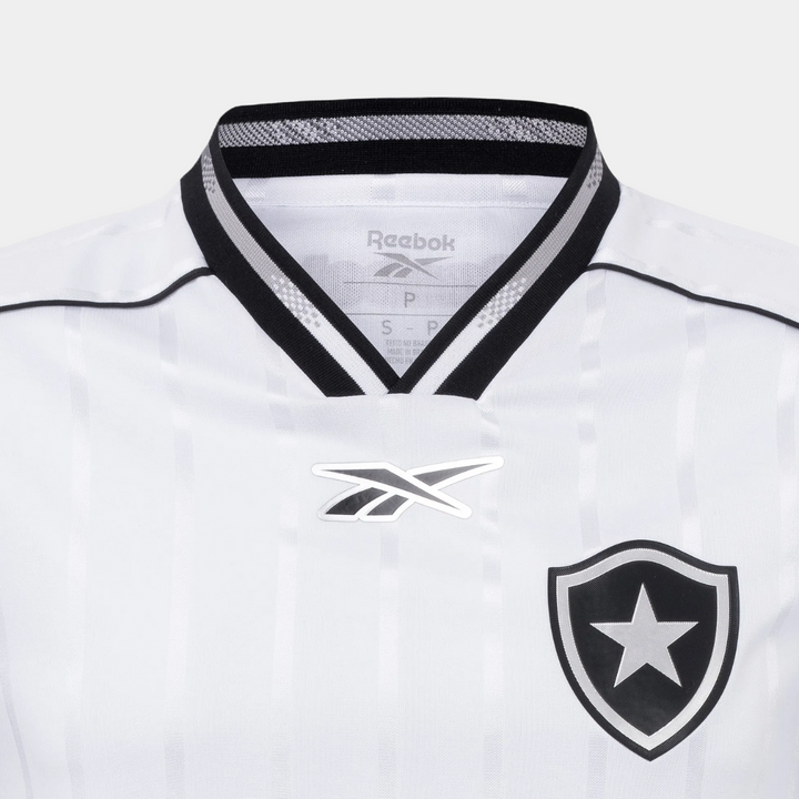 A camisa 2025/26 III do Botafogo chega em base branca com listras verticais em relevo e detalhes em preto, mantendo a identidade alvinegra em um visual clean e imponente. O escudo monocromático bordado no peito e o acabamento premium na gola e nas mangas reforçam a tradição do Glorioso para o dia a dia e para o estádio.