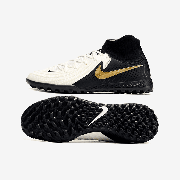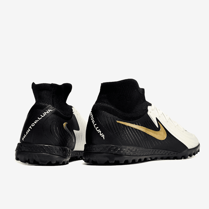 Der Nike Phantom Luna 2 Pro TF kombiniert modernes Design mit leistungsstarker Technologie für Spiele auf Kunstrasen- und Hartplätzen. Im edlen Weiß-Schwarz-Design mit goldenen Akzenten vereint er Stil, Komfort und Ballkontrolle auf höchstem Niveau.