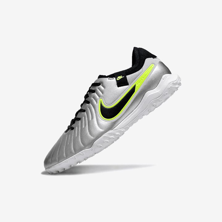 Der Nike Tiempo Legend 10 Pro TF in der neuen Silber-Schwarz-Lime-Version vereint klassische Tiempo-Tradition mit moderner Performance. Dieses markante Design mit metallischem Glanz und neongrünen Akzenten macht ihn zu einem Blickfang auf dem Platz – perfekt für Spieler, die Kontrolle, Komfort und Style verbinden wollen.