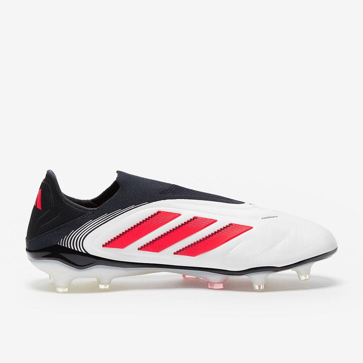 Der adidas Copa Pure 3 Elite FG – schnürungslos vereint minimalistisches Design mit maximalem Ballgefühl. Diese Version in Weiß mit roten Details und schwarzem Schaft wurde für trockene und leicht feuchte Naturrasenplätze entwickelt und bietet absolute Kontrolle bei jeder Aktion.