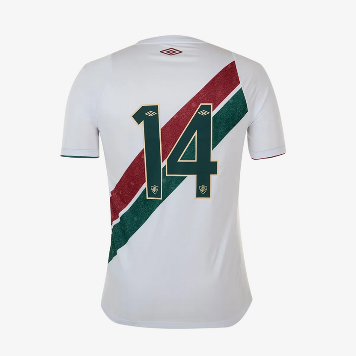 A Camisa Umbro Fluminense 2024/25 II é um verdadeiro símbolo da elegância tricolor. Com design imponente, ela traz o branco como base principal, em contraste com detalhes em grená e verde que reforçam a identidade única do Fluzão.