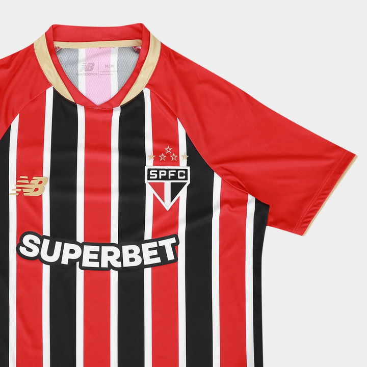 A Camisa Feminina New Balance São Paulo 2025/26 II traz a tradição das listras verticais em vermelho, preto e branco em uma nova releitura com corte feminino. O destaque dourado na gola e nas mangas valoriza ainda mais a peça, enquanto o escudo com as cinco estrelas bordadas no peito exibe com orgulho a grandeza do Tricolor.
