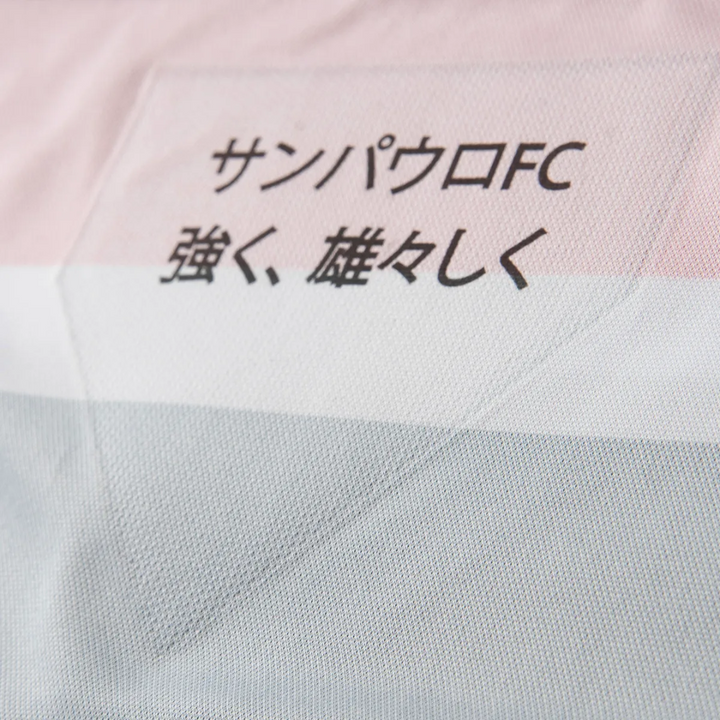 No verso da gola, o minuto 51:09 marca o início do lance da defesa icônica que garantiu o título. Na barra interna, a inscrição reforça o orgulho: único time brasileiro tricampeão mundial. Dentro do escudo, a frase em japonês “São Paulo FC / Tu és forte, tu és grande” conecta tradição, hino e grandeza do clube.